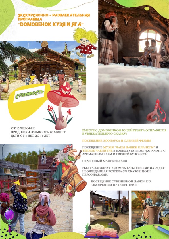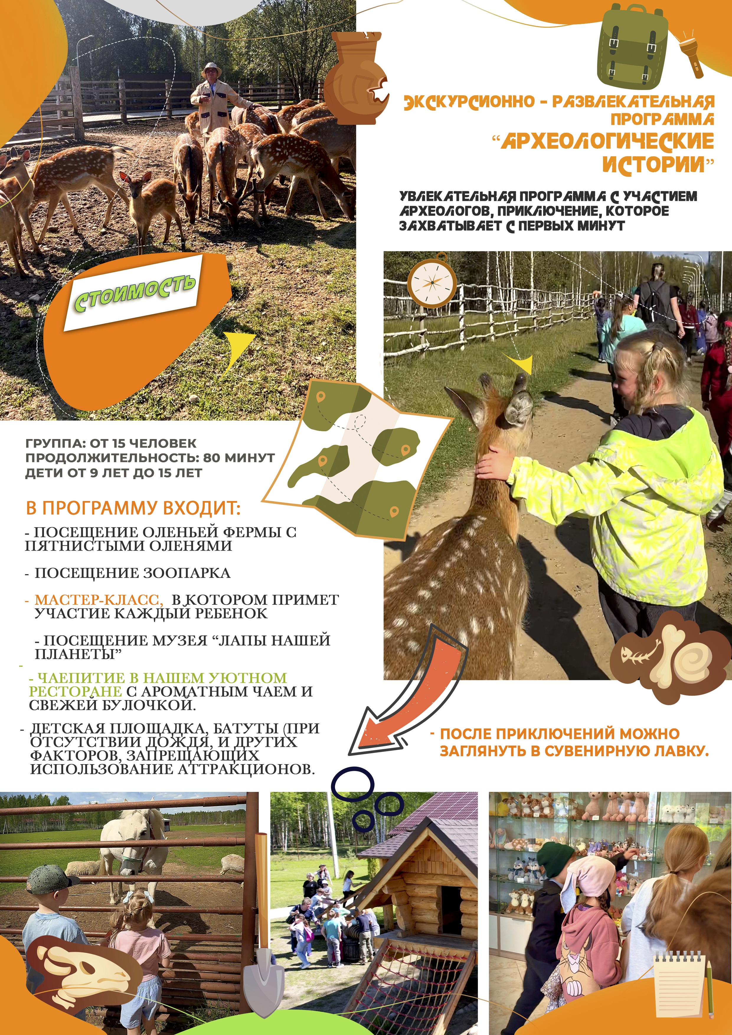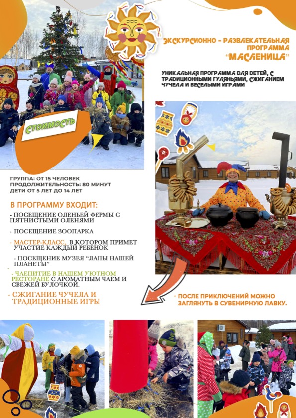 - Также в программе — посещение волшебной оленьей фермы, где можно встретить грациозных пятнистых оленей, мастер-класс, который разбудит творческую искру в каждом ребёнке, посещение музея "ЛАПЫ НАШЕЙ ПЛАНЕТЫ" и тёплое чаепитие в нашем уютном ресторане с ароматным чаем и свежей булочкой.